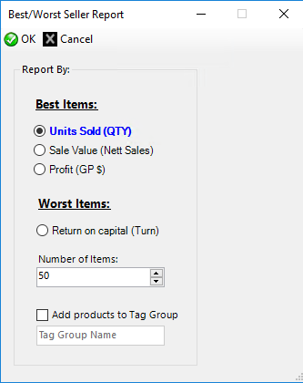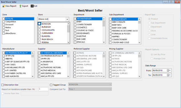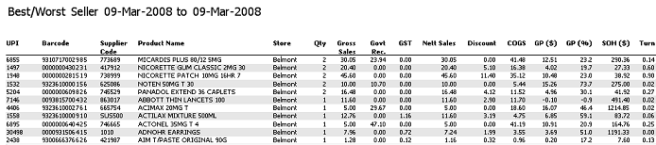 The Best/Worst Seller report lets you select one of the four types of report (three on best sales data, and one on worst sales data), along with a date range option and up to eight fields to be used at filters.