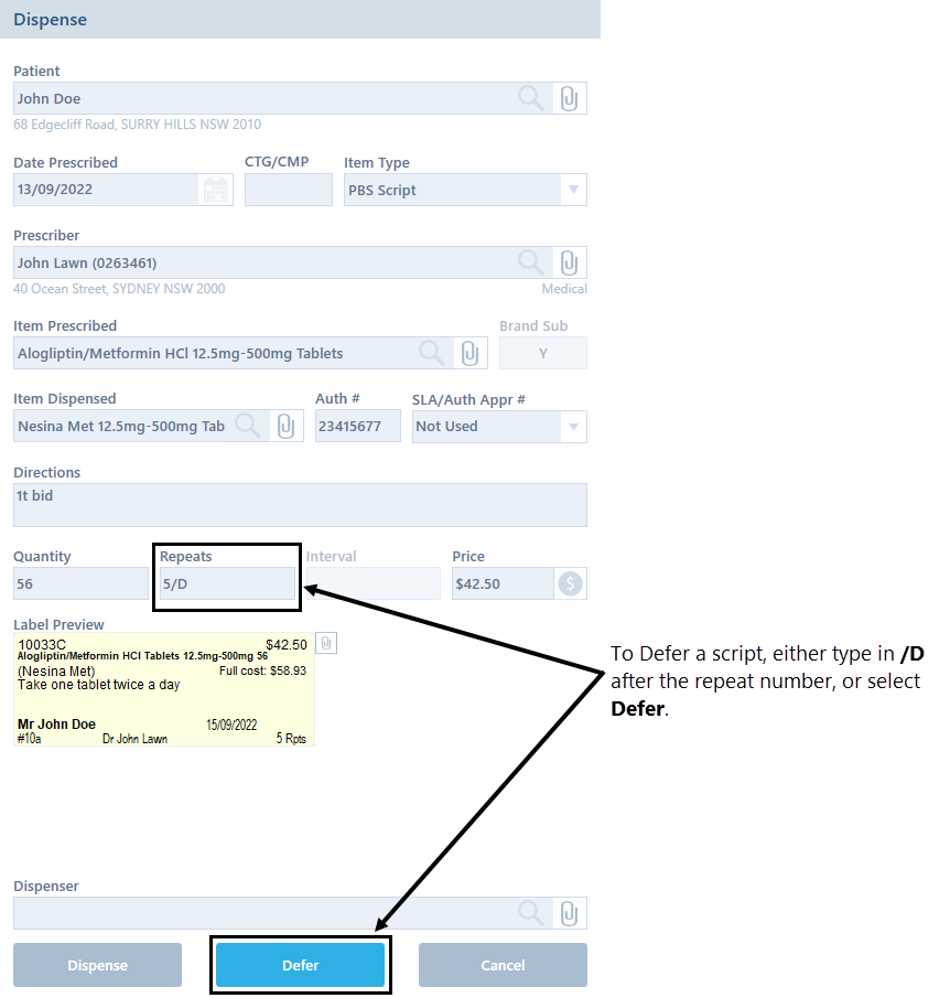 If you want to defer a script for processing at a later time, follow the general workflow for dispensing Original Scripts, however make sure you select Defer at the bottom of the screen, in place of Dispense.