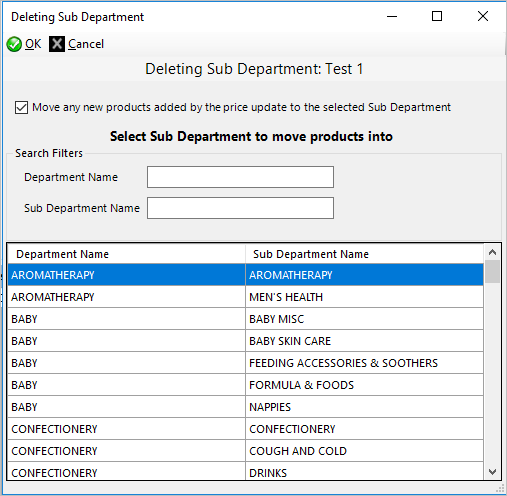You can delete a Sub Department even if there are products associated with it. However, when you delete a Sub Department, the Deleting Sub Department screen governs where the products will be placed. It automatically moves the products to a new Sub Department as selected by you.