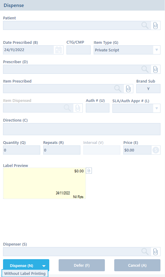 d. Select the arrow and choose Without Label Printing if you want to dispense the script without printing labels.