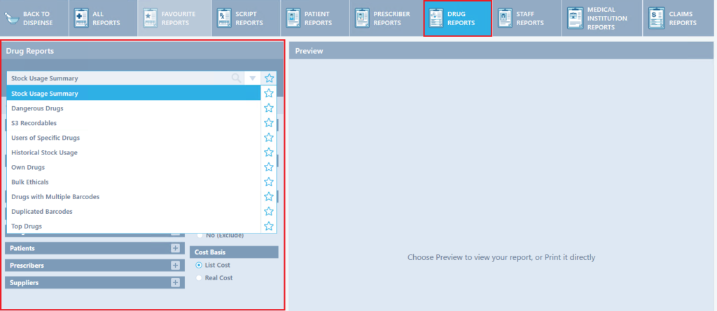 All reports related to drugs can generated using the Drug menu option or by selecting the Drug Reports tab. The reports that you can generate are: