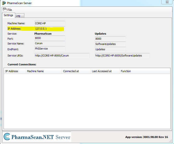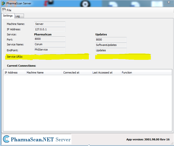 4. This should populate the Service URIs in the Pharmascan software and the Pharmascan should re-connect with the Server. The window will now look more like this: