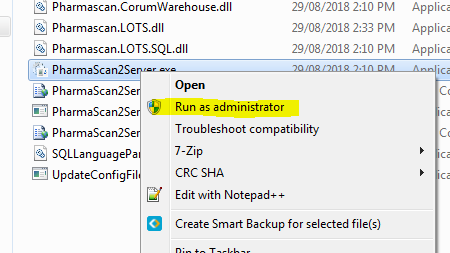 3. Right click on the PharmaScan2Server.exe and then click on Run as Administrator.