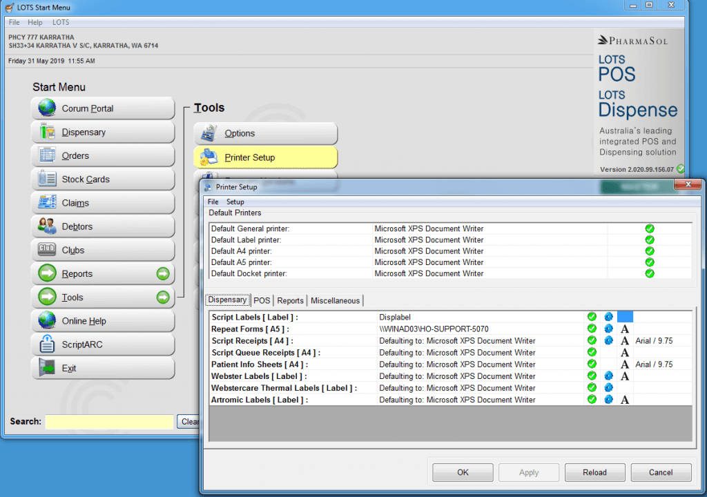 To fix this go to LOTS Main Menu > TOOLS > PRINTER SETUP and select the appropriate printer for the module which the orange box is appearing. e.g POS reports , Dispense repeats , Docket, Shelf or Goods label and so on.