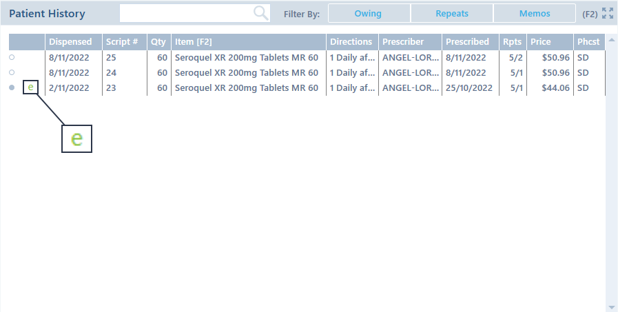 When an eScript has been dispensed and the dispensing record has been received by eRx, the e symbol next to the script in Patient History will change to green.