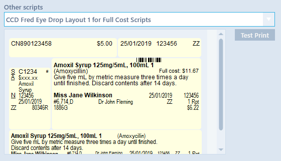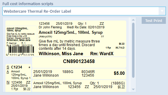 Use the drop down and choose the label type that is required to be printed. A preview of the selected label is displayed below the drop down list. Select the Test Print option to print a test label.