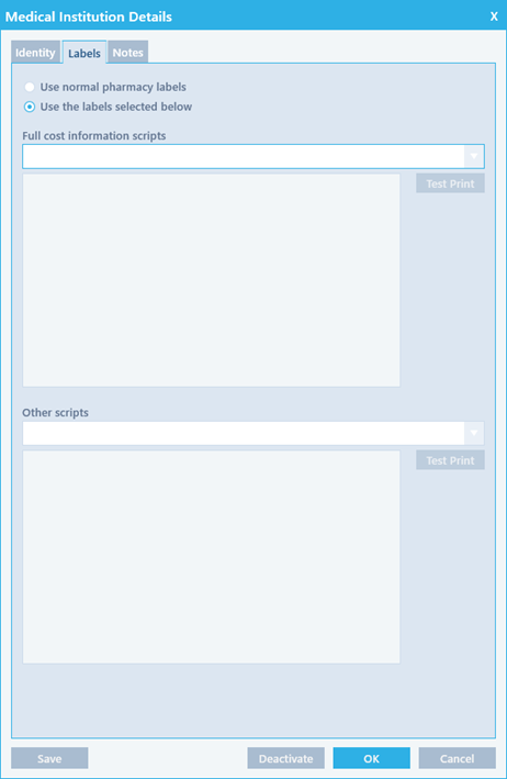 - Select the Use normal pharmacy labels option if the medical institution accepts the default labels set up for your pharmacy.