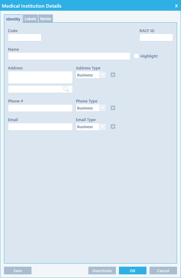 Use the Medical Institution Details screen to add new medical institutions, and to view or update the details of existing medical institutions.