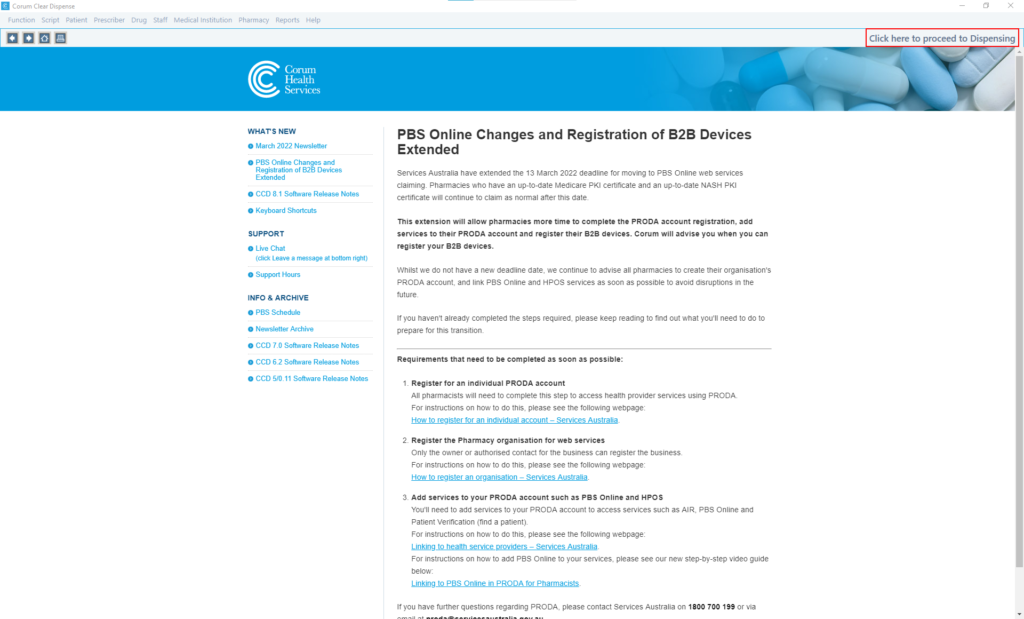 3. On the Corum Clear Dispense start page choose Click here to proceed to Dispensing.