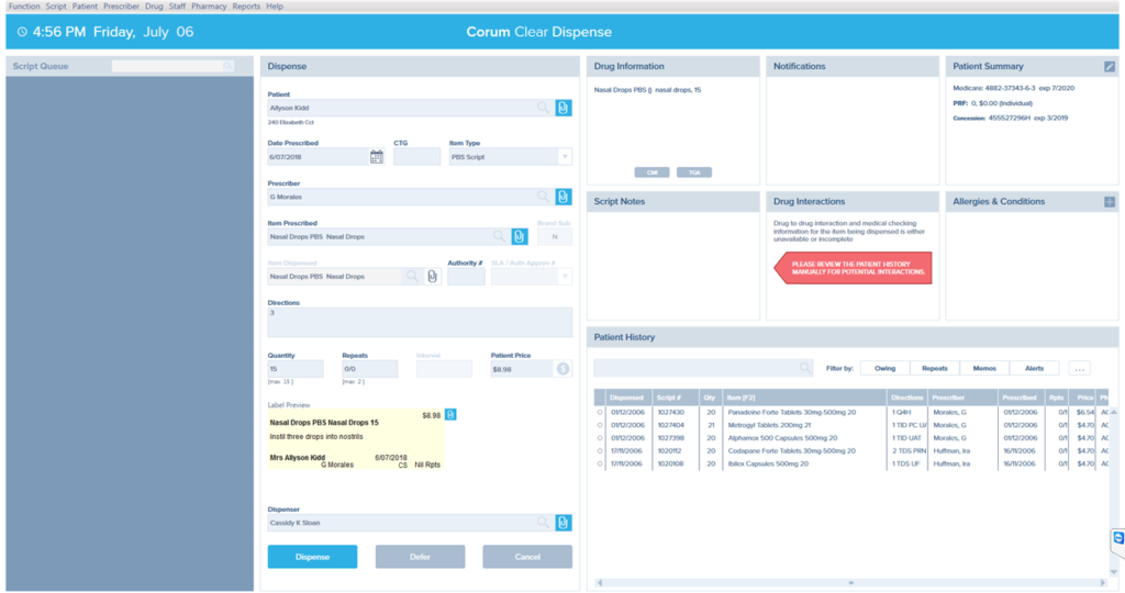 Corum Clear Dispense has two main screens where you dispense your scripts and maintain your claims.