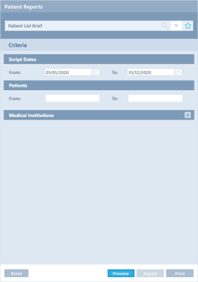 Use the Patient List reports to list patients that have had scripts dispensed within a specified period. You can optionally restrict these reports further, by name range or medical institution.