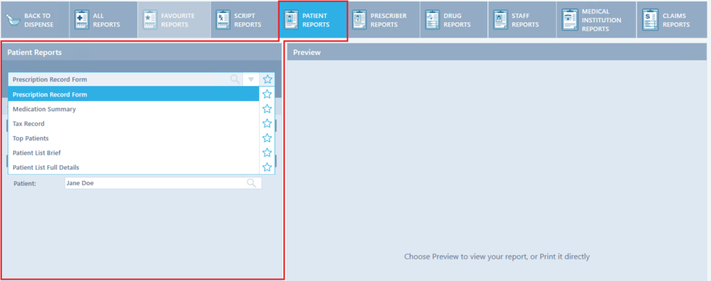 All reports related to scripts can generated using the Patient menu option or by selecting the Patient Reports tab. The reports that you can generate for patients are: