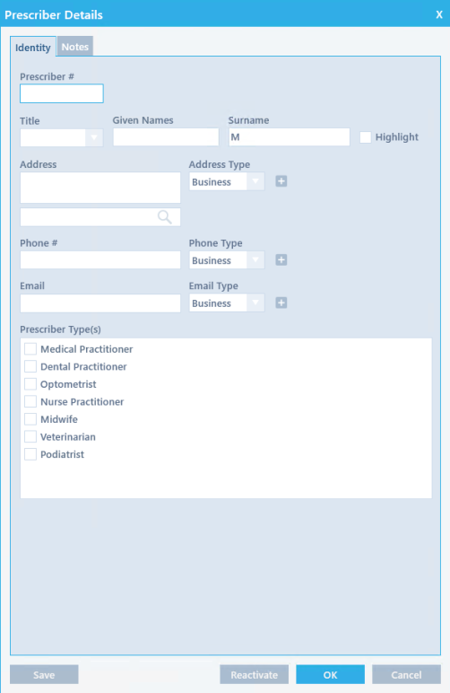 The Identity tab has the most frequently used information about the Prescriber. This section describes the fields and options available to you to enter Prescriber identity details. The Identity tab contains the following fields: