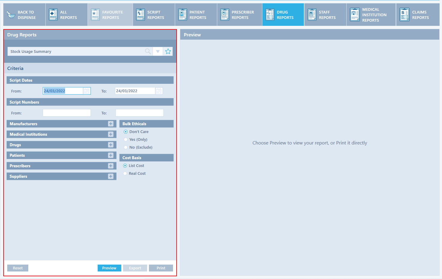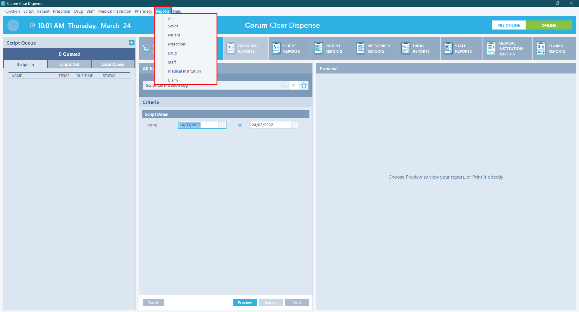 All reports for CCD are listed under the Reports menu on the Dispensing screen.