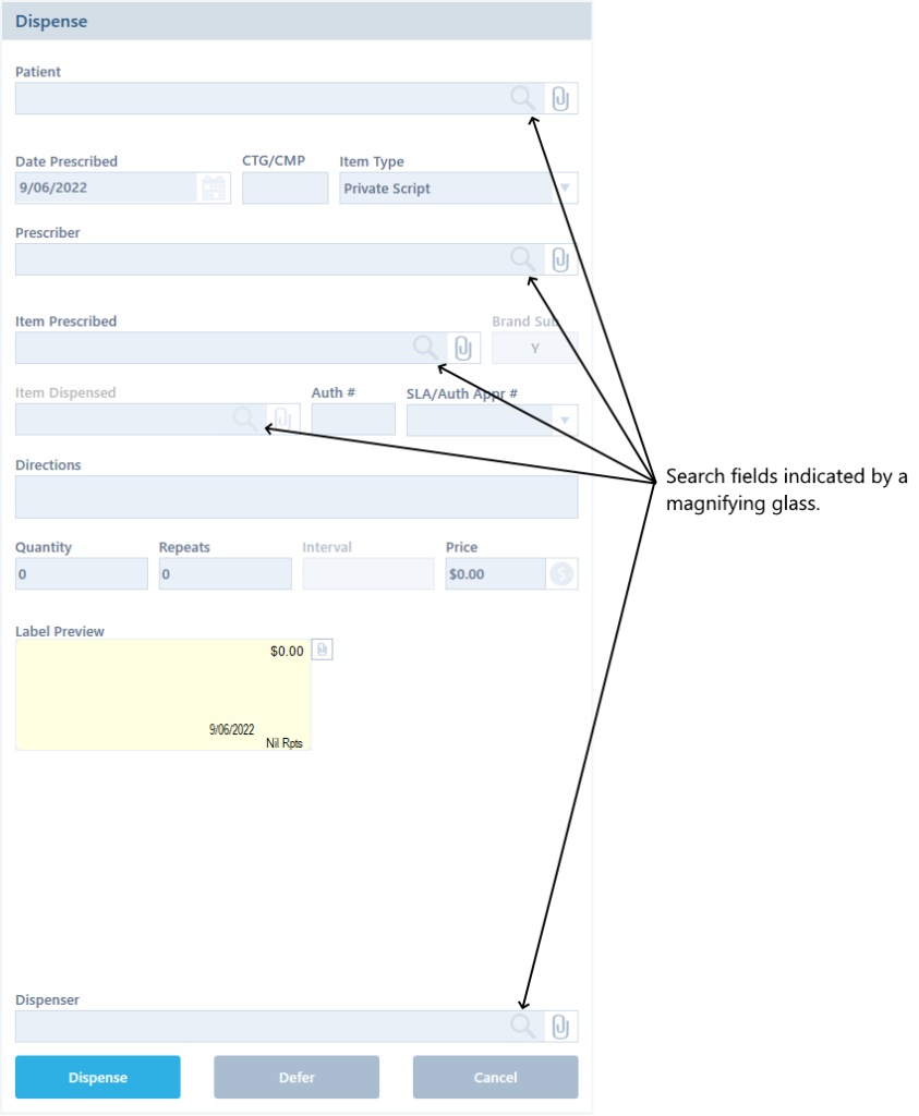 Many areas in the Dispense screen give you the ability to look for information using the search text box. The magnifying lens icon can be used to identify which areas have an active search.