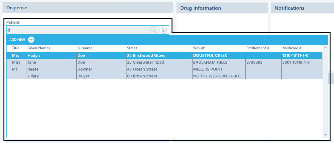 When searching for a patient, you can enter the patient’s name (first or last), a part of the address or the Medicare number. The search control will look for all items that match the search entry and display results with the most probable item listed at the top as the initial entry, followed by all others.