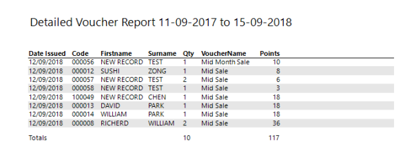- Summary: This option displays the list of different type of vouchers issued, the number of vouchers issued of each type and the total amount of points used to receive the vouchers.